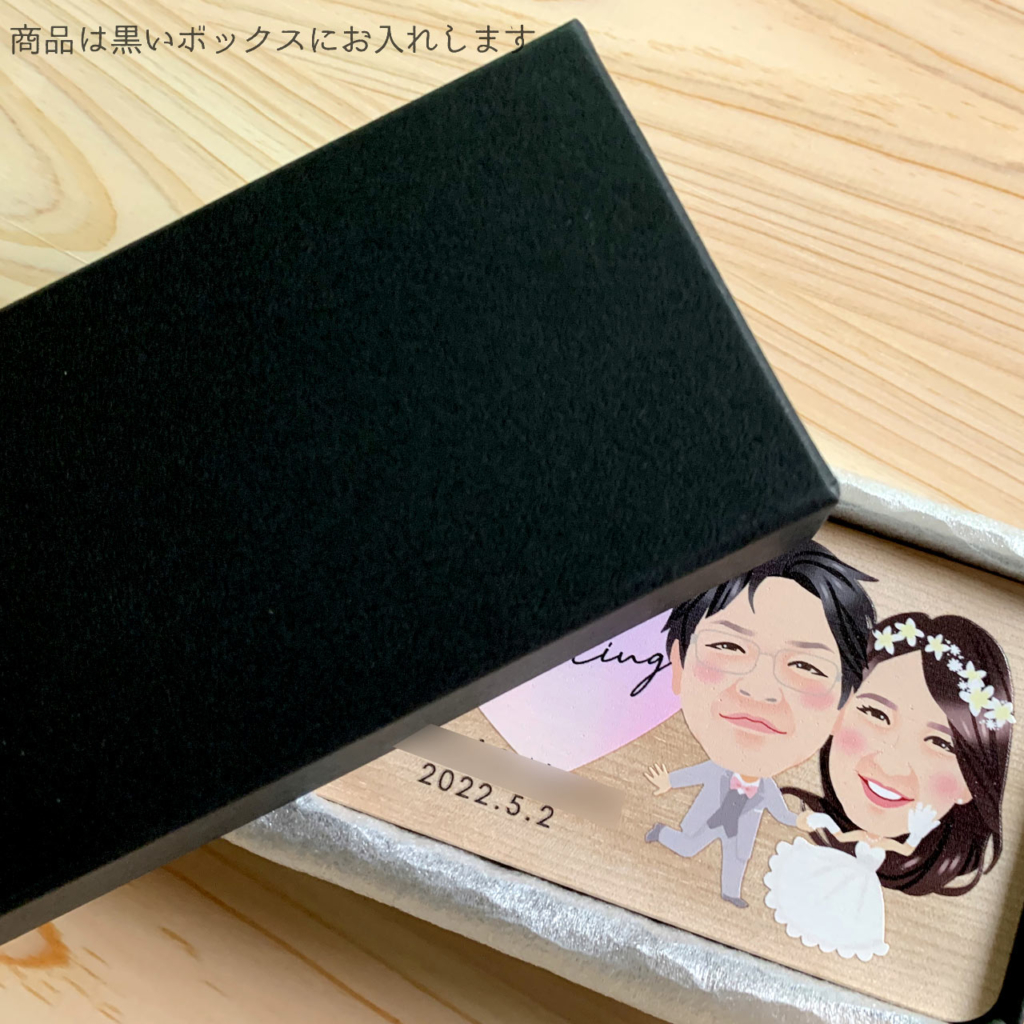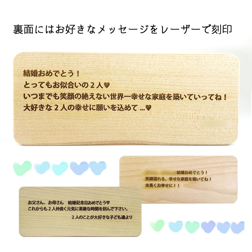 表面にはお二人のお名前と記念日を、裏面にはレーザー刻印でメッセージをお入れします。